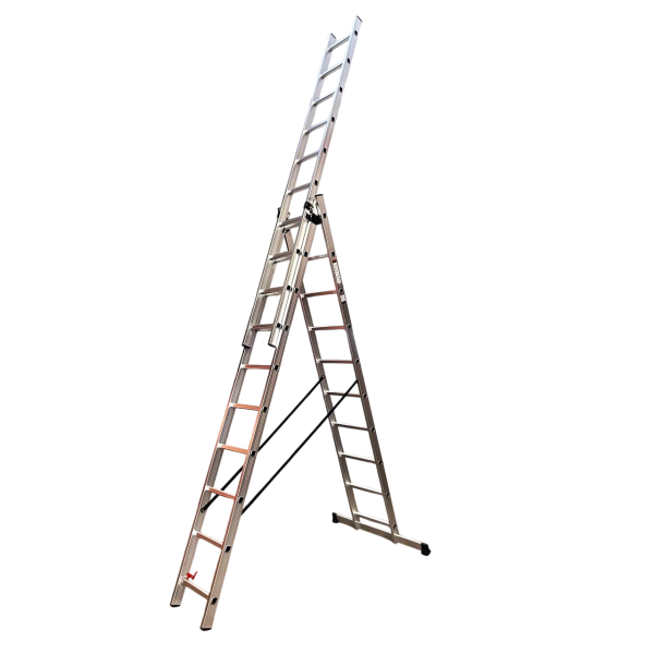 Трехсекционная лестница GTM KME310 – это идеальное решение для любых работ на высоте. Благодаря универсальной конструкции их можно использовать как приставную, выдвижную лестницу или стремянку. Усиленный алюминиевый профиль обеспечивает легкость транспортировки, долговечность и устойчивость к коррозии.
