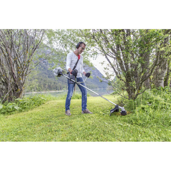 - Двухвариантная режущая система — нож или леска с полуавтоматической подачей — для максимально качественной обработки участков.