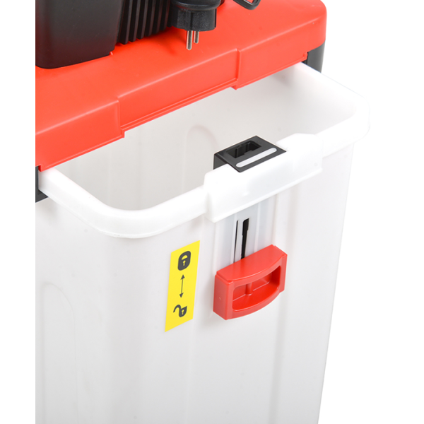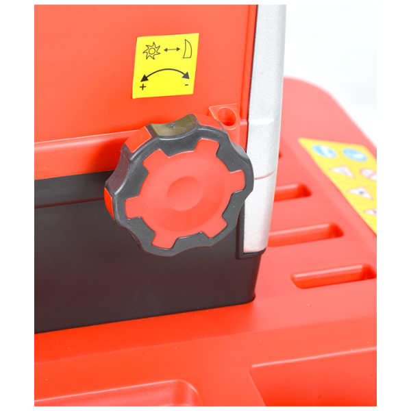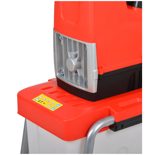 На верхней части измельчителя установлен переключатель для прямого и обратного хода для высвобождения ролика от застрявшей ветки. Переработанный материал собирается в 60-литровой бункер, который вставляется в шредер.